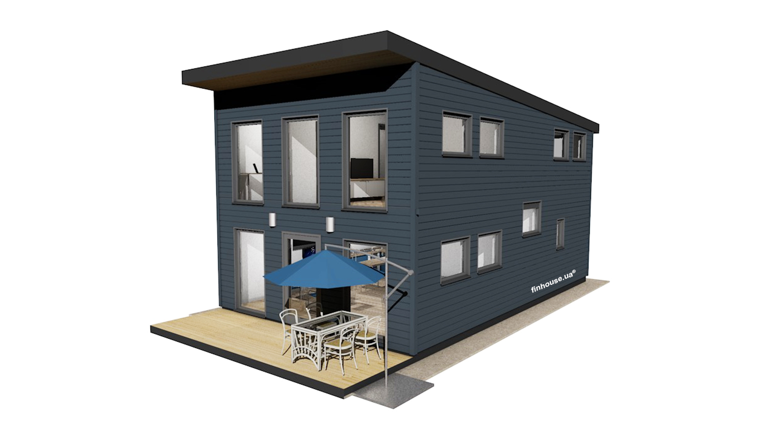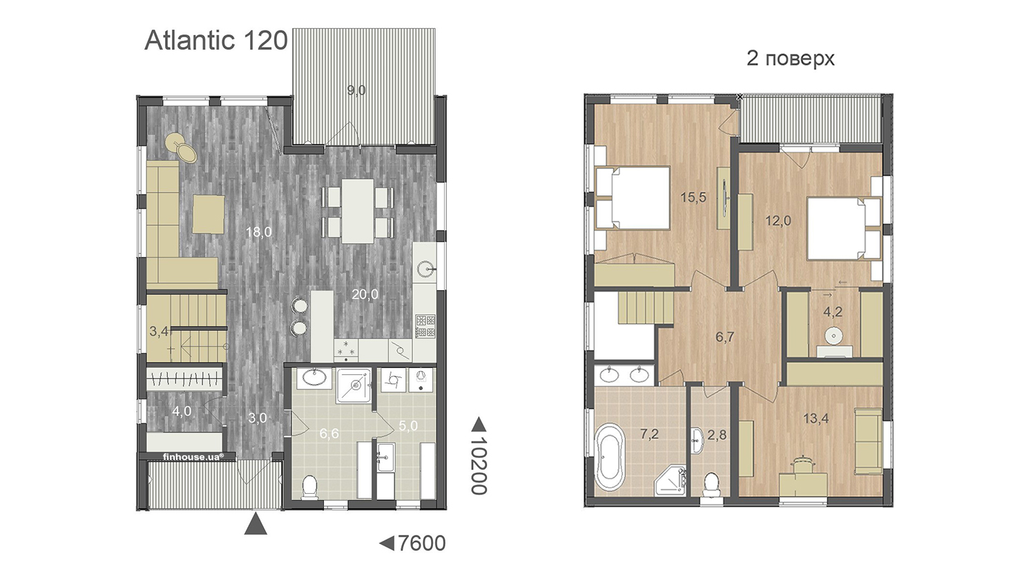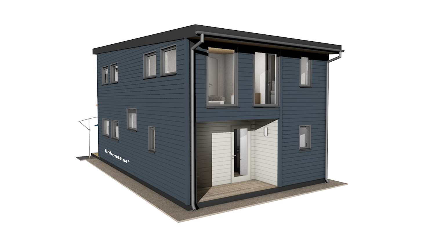 Arctic_100 Проект повноцінного двоповерхового будинку, ідеальний для будівництва на вузький ділянці. Перший поверх – зона загального користування, другий – житловий з двома просторими спальнями, облаштованими окремими вбиральнями, та які відокремлені сходовим маршем.