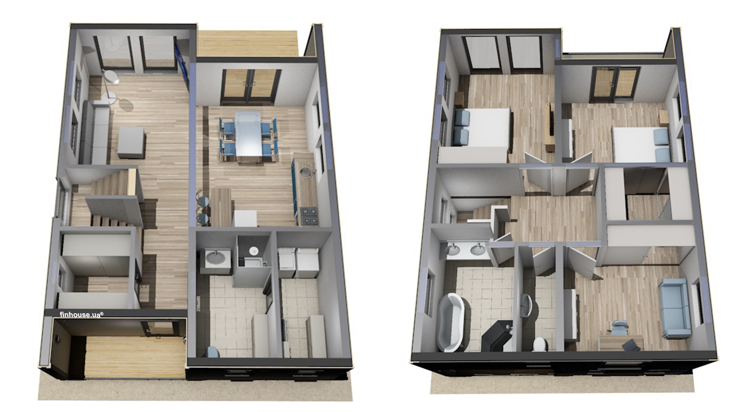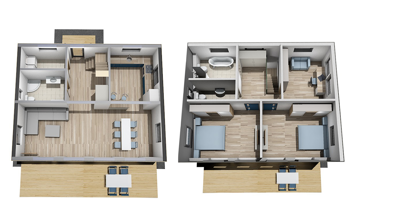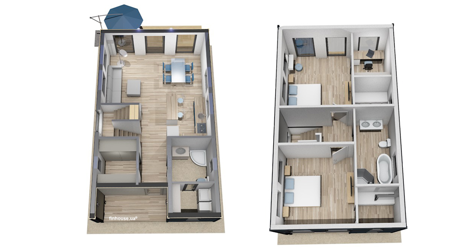 Arctic_100 Проект повноцінного двоповерхового будинку, ідеальний для будівництва на вузький ділянці. Перший поверх – зона загального користування, другий – житловий з двома просторими спальнями, облаштованими окремими вбиральнями, та які відокремлені сходовим маршем.