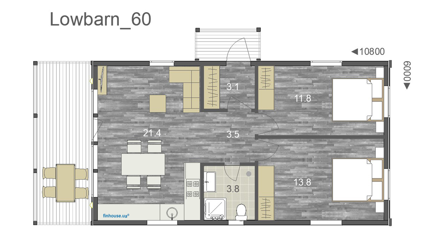 Lowbarn_60 – компактний двокімнатний будинок, який більше підійде для сезонного проживання, із-за відсутності достатніх місць для збереження речей. Стосовно енергозбереження – відповідає потребам для цілорічного проживання.